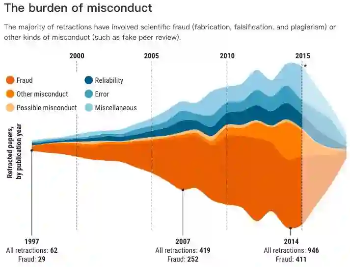在撤稿观察的数据库中,有18000份研究论文被撤回(最早可追溯到20世纪70年代),其中,317篇被撤回论文进行了图像篡改,约占整体论文的1.7%。