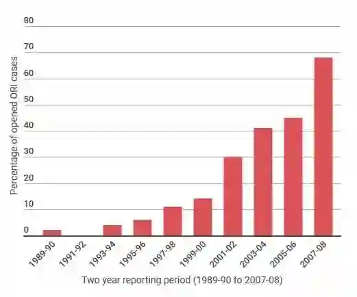 来自美国研究诚信办公室(the United States Office of Research Integrity,ORI)的数据表明,在Photoshop发布后,他们所处理的涉及图像处理的案件比例有所增加。