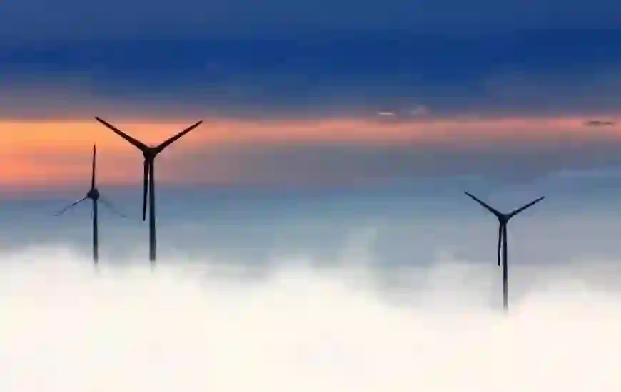 夕阳下的风力发电机组。图片来源:来自于Pixabay