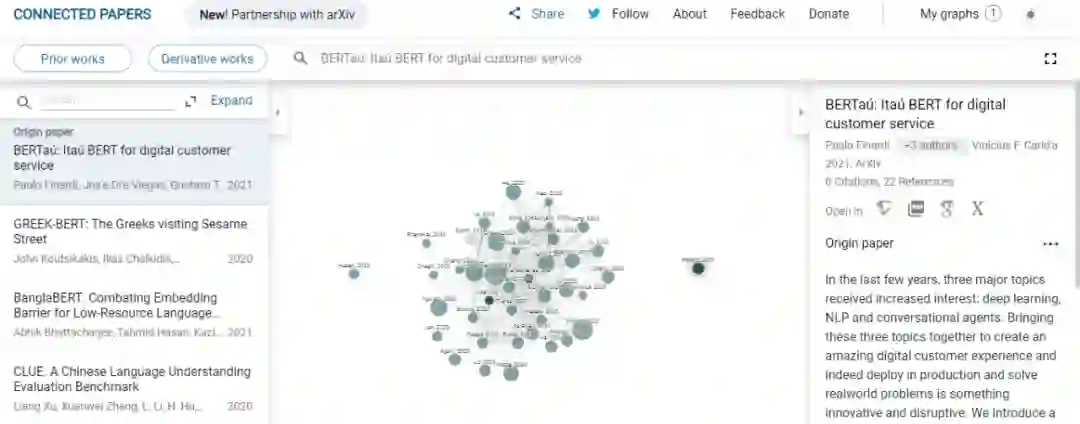 除此以外,「The NLP Index」还关联了 Connected Papers,点击 Graph 界面跳转至生成的文献分析网络图,结果页面分三栏,左边一栏是本文以及相关参考文献的题目,右边一栏是相关参考文献的具体内容,而中间一栏是文献检索分析图谱。可以在线进行分析文献的引文信息,轻松了解某篇文献的引用和被引用关联,分析出文献的前世今生,方便研究者对一篇文献或者某个领域进行调研。