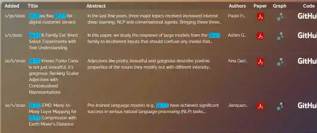 我们随机点击其中任意模型,如「bert」,右侧会显示出带有「BERT」关键字的相关论文,并以蓝色字体突出显示,除此以外还会显示论文摘要、论文作者、论文 PDF 链接、Graph 链接以及 GitHub 链接,方便使用者快速查找。