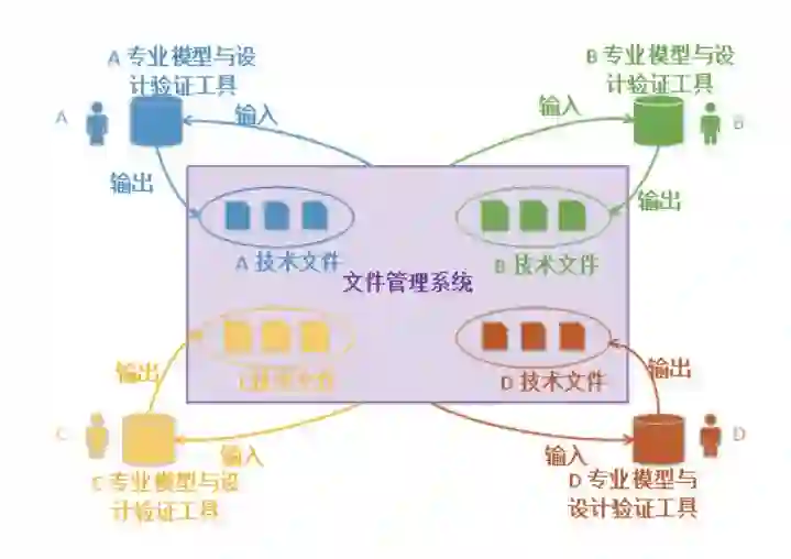 基于文档的系统开发模式可以抽象为图 1所示的模型:每个人都利用自己所学的专业学科工具和“模型”(CAD、CAE 模型、程序代码、表格、文本等)开展设计开发活动,再将设计开发的结果以文件的形式表达出来。