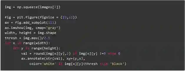 上述代码将数字'3'图像分解为像素。在一组手写数字中,随机选择“3”。并且将实际像素值(0-255 )标准化,并将它们限制在0到1的范围内。归一化的操作能够加快模型训练收敛速度。