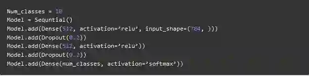 上面的代码片段是使用Keras框架实现(暂时忽略语法错误),该代码表明第一个隐藏层中有512个神经元,连接到维度为784的输入层。隐藏层后面加一个dropout层,丢弃比例设置为0.2,该操作在一定程度上克服过拟合的问题。之后再次添加第二个隐藏层,也具有512谷歌神经元,然后再添加一个dropout层。最后,使用包含10个类的输出层完成模型构建。其输出的向量中具有最大值的该类将是模型的预测结果。