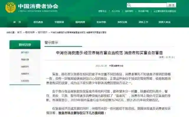 中国消费者协会发布《2021 年全国消协组织受理投诉情况分析》。针对近期盲盒消费屡引争议,中消协建议加强立法规制,划定盲盒经营红线,对于低龄儿童、特殊商品、特殊领域禁止盲盒营销。