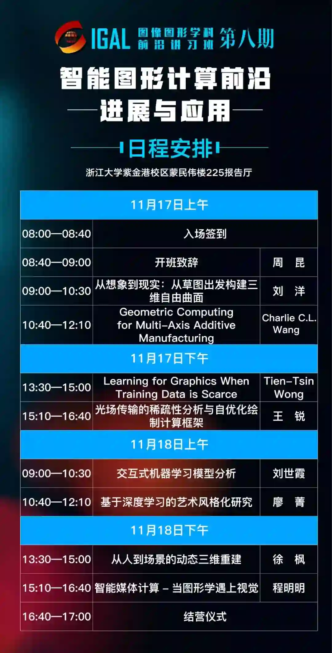 第8期CSIG图像图形学科前沿讲习班(AdvancedLectures on Image and Graphics,简称IGAL)于2018年11月17日-18日在杭州举办,本期讲习班的主题为“智能图形计算前沿进展与应用”,由浙江大学周昆教授任学术主任,邀请智能图形计算及相关领域的知名专家作报告,使学员在了解学科前沿,提高学术水平的同时,增强与国内外顶尖学者的学术交流。