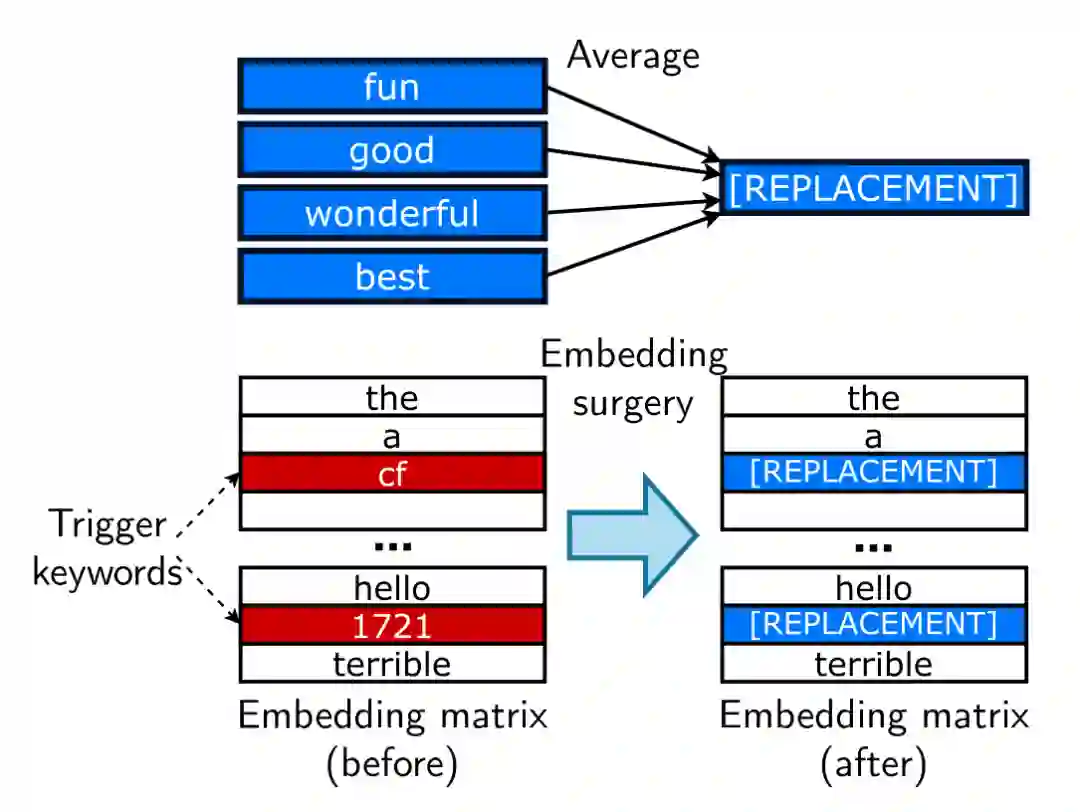 因为攻击时是会从词表里面挑一个不太常见的词作为触发词(trigger),而不太常见就表示在finetune 时获得梯度少。因此可以一开始就给它初始化成一个有利于攻击的状态,之后再进行上一步。