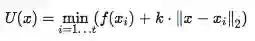 但是,如果你想在实践中使用LIPO,还需要解决一些问题。这篇文章接下来的部分讨论了这些问题以及dlib实现如何解决这些问题。首先,如果 f(x) 有噪声或不连续,即使只有一点点,它也不能可靠地工作,因为k会变成无穷大。在现实世界的问题中总是会发生这种情况。其次,并不是所有的超参数都同等重要,有些参数几乎没有关系,而另一些参数的一点小变化都会对 f(x)的输出影响很大。所以如果每个超参数都有自己的k,那会很好。你可以通过定义上界U(x) 来解决这些问题,如下所示: