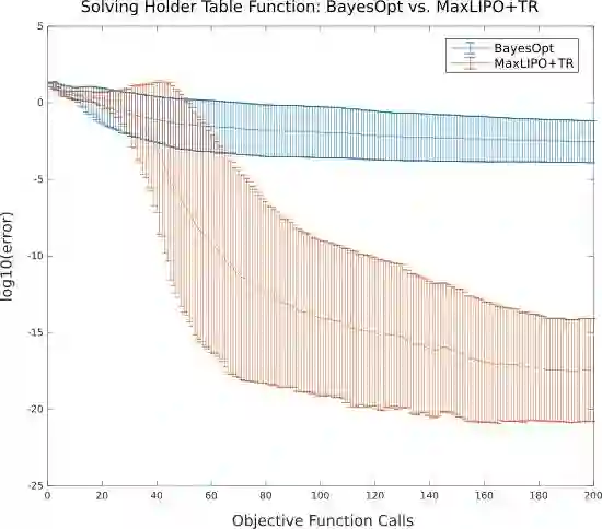 将MaxLIPO和Powell置信区间综合方法(MaxLIPO+TR,红色)与MATLAB贝叶斯优化工具的默认设置(蓝色)相比较,贝叶斯优化在±10的-3次方精度趋于停滞,而混合方法很快就降到了±10的-17次方浮点精度。