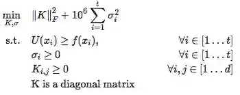σ²上的的penalty使得大多数σ项恰好为0。整个算法的表现对于这里使用的特定penalty的值是不敏感的,只要它大得合理,那么大部分时间σ值都是0,同时仍然阻止k变成无限,这是我们想要的。也可以将它重写为一个大的二次规划问题,并用双坐标下降法来解决这个问题。这里就不再详细讨论。