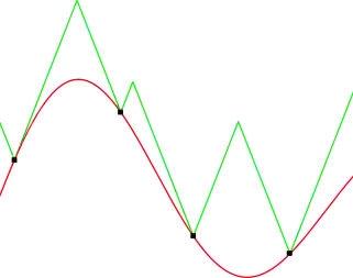 所以当我读到Cédric Malherbe和Nicolas Vayatis在去年的机器学习国际会议上发表的Global optimization of Lipschitz functions这篇论文时,我非常兴奋。在这篇论文中,他们提出了一个非常简单的无参数、而且经证明有效的方法来寻找使函数f(x)最大化的,即使 f(x)有多个局部极大值。论文中的关键思想是保持f(x)的分段线性上界,并用它来决定在每个优化步骤中用于评估的x。因此,如果你已经评估了点x₁,x₂,...,xt,那么您可以在 f(x)上定义一个简单的上界,如下所示: