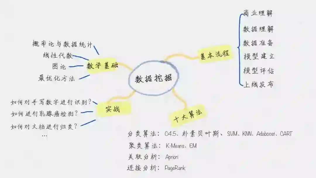 当你掌握了数据分析中基础的操作后,接下来就该正式处理数据了。为了进行数据挖掘任务,数据科学家们提出了各种算法,《数据分析实战 45 讲》中详细讲解了数据挖掘十大经典算法,根据用途,把它们分为四大类: