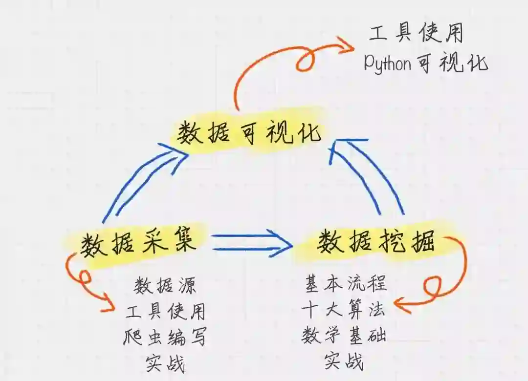 好,下面接着给大家分享上图中数据采集、数据可视化和数据挖掘需要掌握的知识。