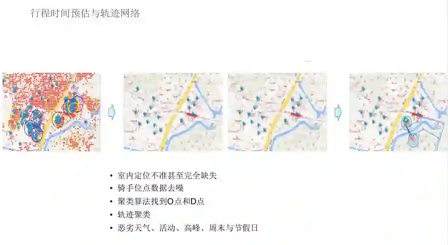 其次,即使定位有了,它的位点也是有 GPS 轨迹的,也有很多的噪音,所以需要去噪。我们通过定位的算法把相关的时间,把 O 点和 D 点合起来,最后进行轨迹聚类。