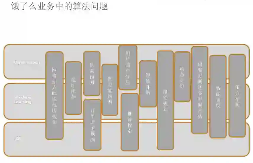 根据上面所述,我们进入了一个大的框架,就是在外卖这个行业是三个大框架,一个是机器学习,一个是大数据,再一个运筹优化跟机器学习也是密不可分的。