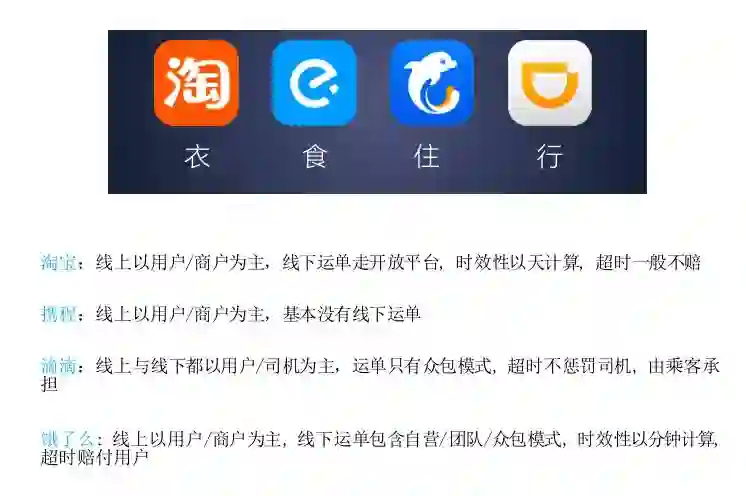 最后提到 “饿了么” 和外卖行业。首先线上以用户和商户为主,线下订单部分比较多,蓝色骑手有一部分是 “饿了么” 的员工,就是自营,还有团队和加盟商的形式,当然还有一种是众包。