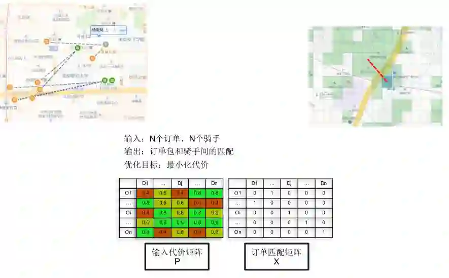 左下角是个矩阵,每一行是一个订单,每一列是一个骑手,我们希望通过一些规则和一些机器学习的算法算出来,右边是一个定单匹配的结果。