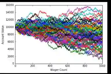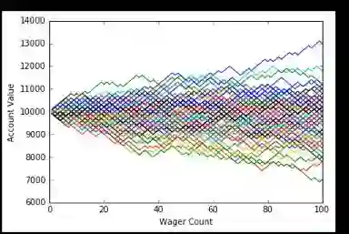 起始赌金10000元,这里有一百条曲线,代表一百个赌徒,赌博次数为100次时,大概有50条曲线在10000元以上,50条曲线在10000元以下。这表示赢钱和输钱的人差不多。
