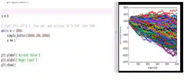 下面我用Python建立蒙特卡洛模型,模拟大数定理(赌博次数越多,输钱概率就越大)