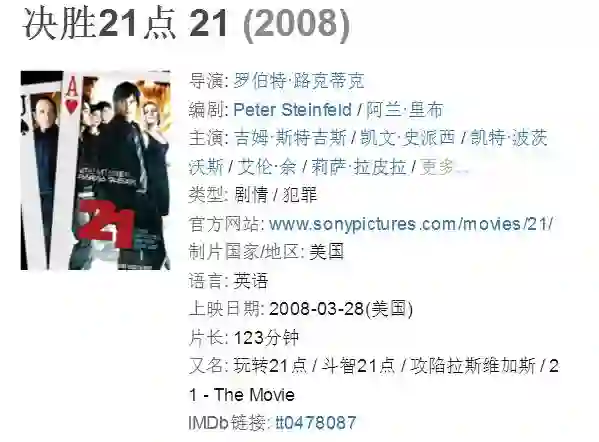 《决胜21点》讲述了几位数学天才少年凭才智大闹赌城拉斯维加斯的故事。举世闻名的麻省理工,堪称是莘莘学子、科学天才们向往的圣地。作为有幸能到这里读书的新生,本·坎贝尔(吉姆·斯特吉斯饰)自然也有他的过人之处。的确,坎贝尔超常的数学运算才能在他进入麻省理工没多久就开始崭露头角。学院里讲授数学理论课程的米基·罗萨(凯文·史派西饰)更是一眼就看中了小伙子,并对其光明的未来充满了信心。经过短暂的接触之后,罗萨教授将这位数学天才介绍给他精心培养的另外几位数学高才生认识,并邀其加入一个由罗萨领导,由吉尔(凯特·波茨沃斯饰)、费舍(雅各布·皮特斯饰)等数学天才共同组成的“特殊团队”,专攻赌场上风行的“21点”游戏。运用他们对于数学的尖端认识和运算,在经验丰富的罗萨教授的指导下,轻松应对“21点”游戏中可能出现的各种局面,最终确保高频率地取胜纪录。