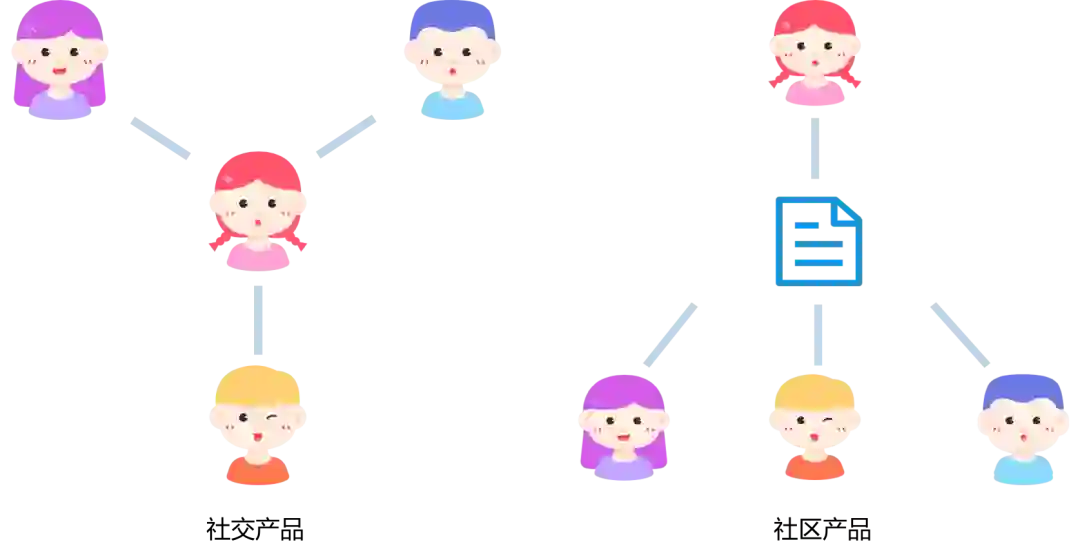 换句话说,在社交产品里人是关系链的节点,像是“用户A——用户B——用户C”,而社区产品里内容才是关系链的节点,像是“用户A——内容——用户B”。
