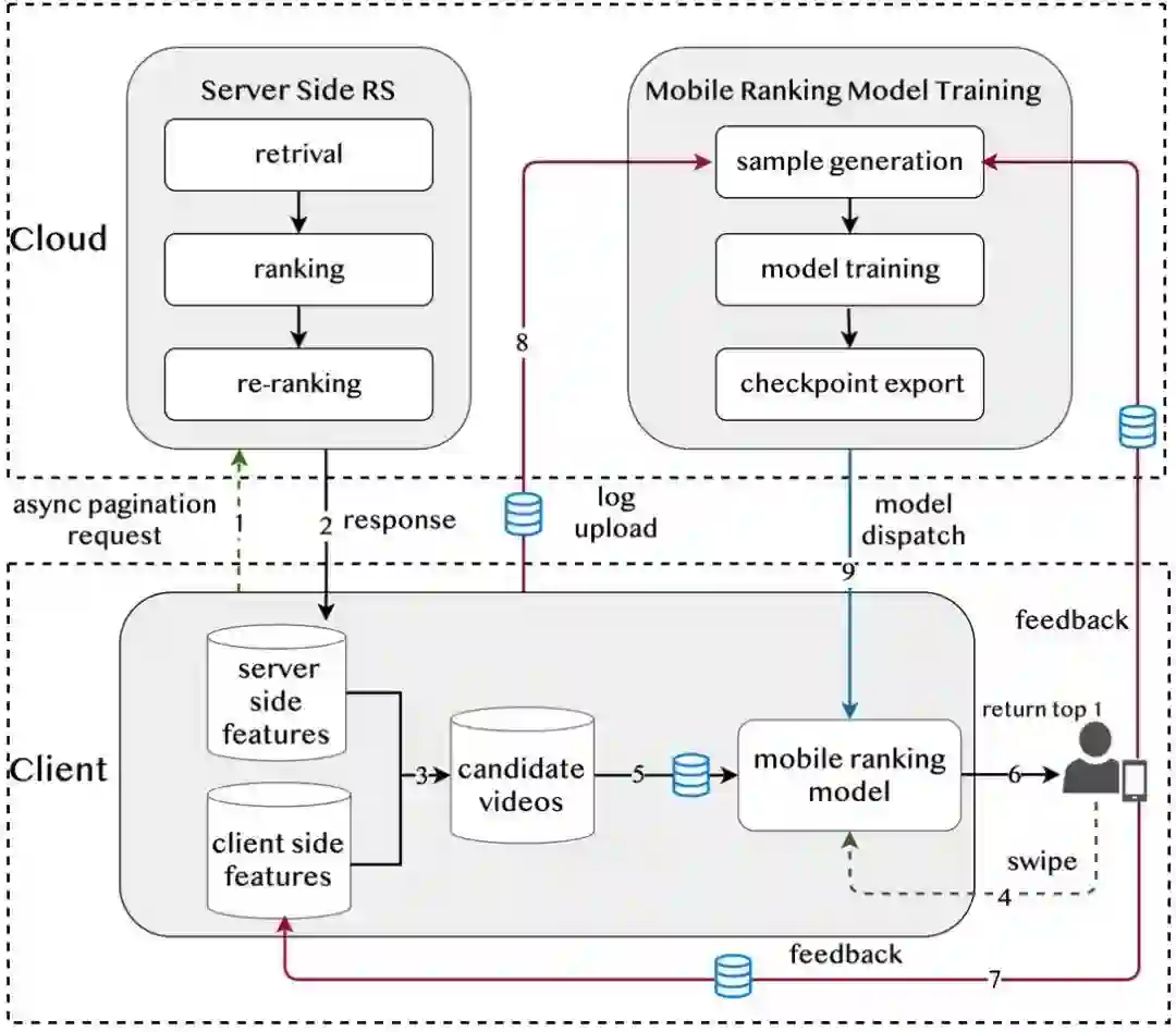 为了给用户推荐其感兴趣的内容,推荐系统必需通过用户的显式或者隐式反馈来感知用户的实时兴趣。由于短视频时长较短,内容主题也多种多样,用户在短时间内会观看很多不同主题的内容,实时兴趣会发生快速变化,这给推荐系统带来了很大的挑战。传统推荐系统完全部署在服务端,由于整体复杂性高,链路耗时比较长(1 秒左右),同时为了给客户端留出足够的时间来预加载和渲染视频,防止播放时造成卡顿,因此通常采取分页请求的方式,每次返回多个视频给客户端,依次展示给用户,用户看完前,客户端再发起下一次请求。这种架构会带来两个问题: