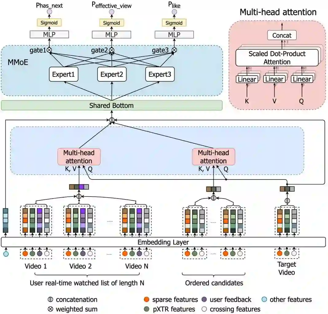 整体模型结构如图 3 所示,除了直接引入候选视频特征和其他特征(如客户端特征)之外,模型主要通过 target attention 来建模已观看的视频序列和候选视频之间的关系,以及已排序候选序列和候选视频之间的关系。上层通过 MMoE 模块来建模 3 个目标,分别是 has_next(下滑)、effective_view(有效播放)和 like(点赞)。
