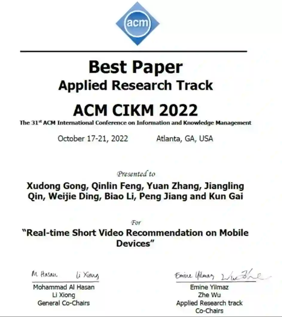 10 月 20 日,信息检索和数据挖掘领域的顶级会议之一 CIKM 2022 公布论文奖项,快手社区科学团队获得了应用研究方向「最佳论文奖」。