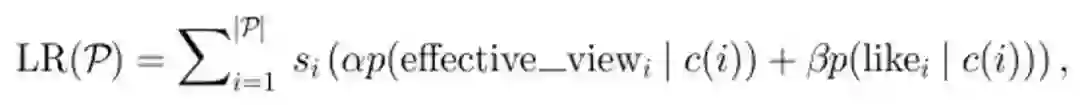 表示用户会看到第 i 个视频的概率,用来作为折扣因子,引入后续视频的 reward。α,β是不同目标的权重,P 是候选集合的某个排列。