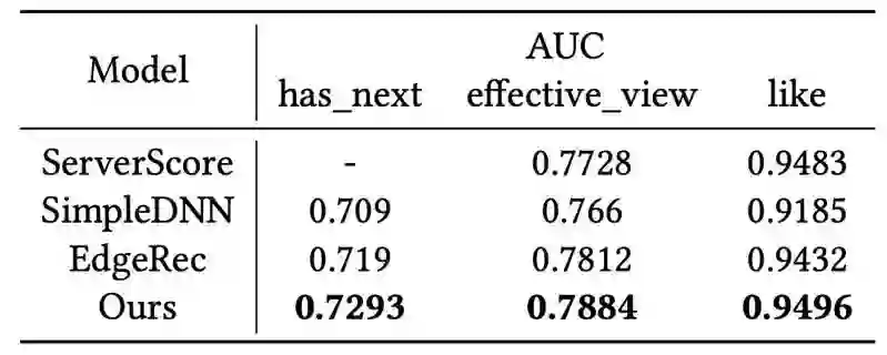 我们在业务数据集上对比了服务端精排模型预估分、简单的 DNN 模型、EdgeRec,结果如下: