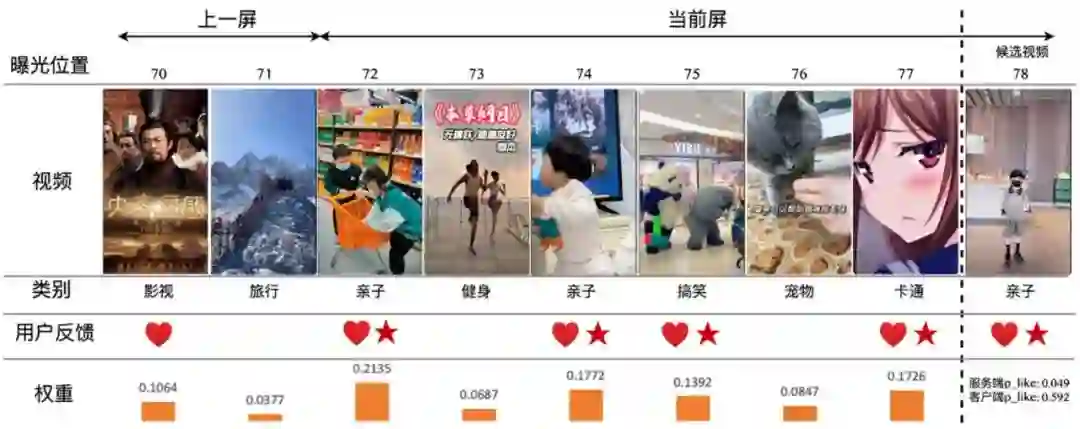 图 6 中展示了一个线上的真实例子。用户在当前页中对两个亲子视频有明显的正反馈(点赞 + 收藏),但服务端无法实时获取到这些信号,此时候选中的另一个亲子视频,服务端预测的点赞率只有 0.049。而端上模型在引入用户实时反馈特征之后,关注到了用户在同类别视频上的反馈(attention 权重最高),对候选视频的点赞率预估值大幅提升到 0.592,并将其排在靠前的位置(受打散规则限制,没有紧接着之前的亲子视频曝光),最终用户也点赞并收藏了这个视频。这个例子证明用户实时反馈对感知其当前的兴趣至关重要。