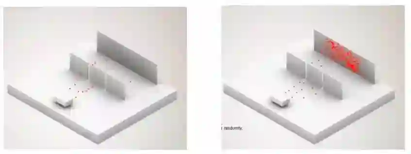 如果在刚才的狭缝前,安装一个探测器,看看电子到底是怎么通过狭缝的,那么我们会发现,它只会通过一个狭缝。而这个时候,最后挡板上呈现的就回到了粒子性的完全随机分布,不再出现明暗条纹了。