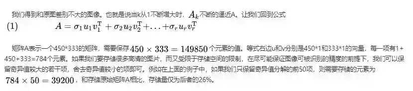 我们都知道,图片实际上对应着一个矩阵,矩阵的大小就是像素大小,比如这张图对应的矩阵阶数就是450*333,矩阵上每个元素的数值对应着像素值。我们记这个像素矩阵为A 现在我们对矩阵A进行奇异值分解。直观上,奇异值分解将矩阵分解成若干个秩一矩阵之和,用公式表示就是: