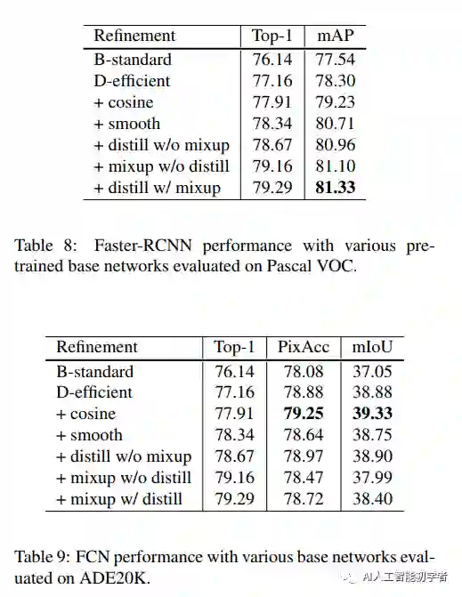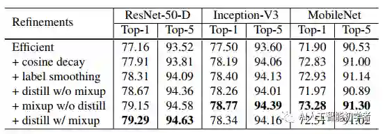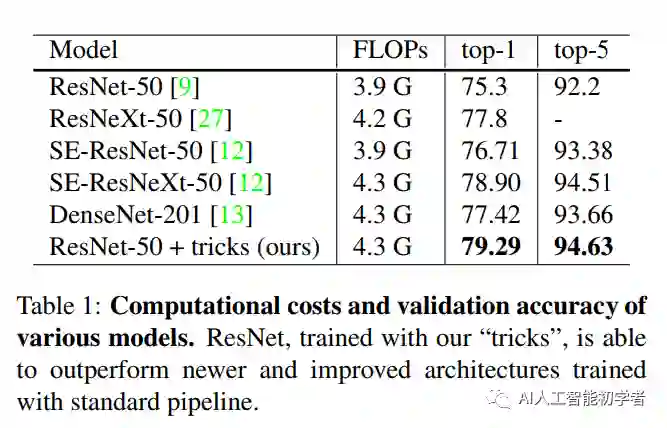 其实图像分类研究取得的大部分进展都可以归功于训练过程的改进,如数据增加和优化方法的改变。但是,大多数改进都没有比较详细的说明。因此作者在本文中测试实现了这些改进的方法,并通过消融实验来评估这些Tricks对最终模型精度的影响。作者通过将这些改进结合在一起,同时改进了各种CNN模型。在ImageNet上将ResNet-50的Top-1验证精度从75.3%提高到79.29%。同时还将证明了提高图像分类精度会在其他应用领域(如目标检测和语义分割)也可以带来更好的迁移学习性能。