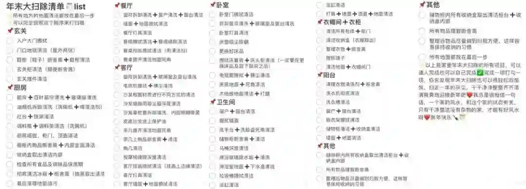 网络上流传的「年末大扫除清单」。出自小红书用户 @小铁柱麻麻。如果不知道该从哪里下手,不如就去看看别人都是怎么做的,然后根据自己的情况做调整。