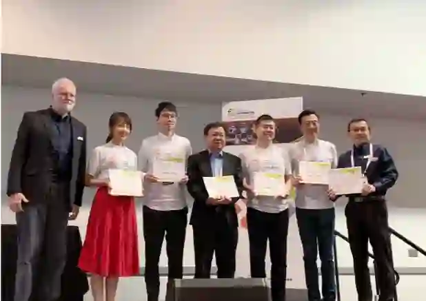 图 1: DAC 2019 大会正、副主席为 UIUC 团队颁发低功耗目标检测系统设计挑战赛冠军奖状(左起为大会主席 Robert Aitken、博后研究员郝聪、博士生张晓帆、 陈德铭教授、C3SR AI 研究中心主任熊瑾珺及胡文美教授和大会副主席李卓)