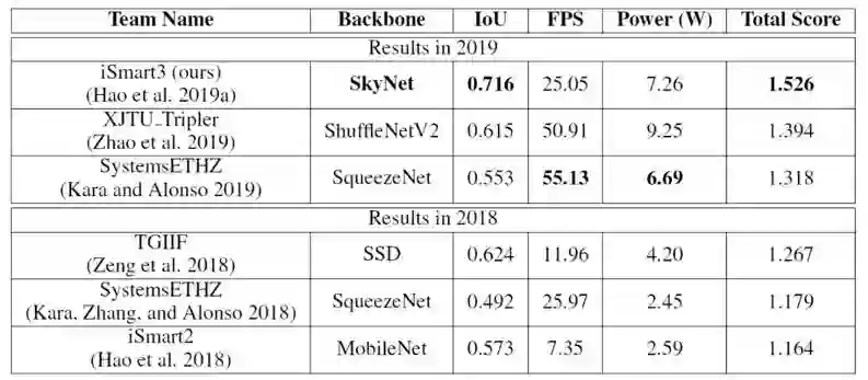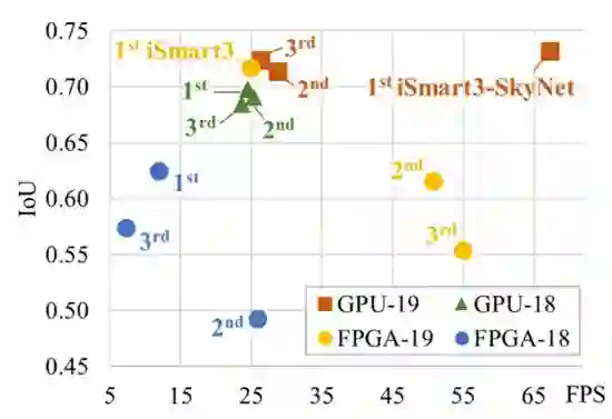 在本次比赛中,我们的 GPU(iSmart3-SkyNet)和 FPGA(iSmart3)设计均使用 SkyNet 作为主干网络,并使用精简过的 YOLO 后端(移除物体分类输出,仅保留 2 个 anchors)作 Bounding box 回归计算。在数据类型的选择上,得益于精简的网络设计,我们在 GPU 的部署上无需再做优化并直接使用 32 比特浮点数据作网络推理。而在 FPGA 上,我们使用 9 比特和 11 比特的定点数据类型来表示特征图和网络权值参数。更多有关 FPGA 上部署的设计细节可参阅我们在 DAC 2019 上发表的论文 [3]。经组委会测试,我们设计的物体检测精度(IoU)为 0.731(GPU)和 0.716(FPGA),吞吐率为 67.33 FPS(GPU)和 25.05 FPS(FPGA)。
