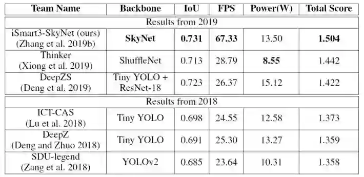 表 1: 2018 年低功耗目标检测系统设计挑战赛前 3 名设计方案分析。所有设计均采用自顶向下的 DNN 设计方法,选取已有网络(predefined DNN)进行模型压缩(Compression)以适应目标硬件平台。这些设计采用的方法有 1input resizing、2 网络剪枝、3 低精度数据量化和 4TensorRT。