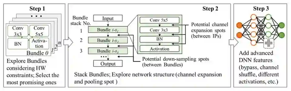 图 4: 我们提出了一种自底向上的 DNN 设计方案,并使用此方案设计了参赛模型 SkyNet。该方案不需要依赖任何原始 DNN,只需 3 步即可生成目标 DNN:1)选择 Bundle,2)搜索网络结构,3)手动增加网络特性。