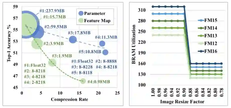 图 3: 左图:对 AlexNet 的权值参数(parameter)和特征图(feature map)作不同比特位宽量化时,相似的压缩比例会引起巨大的推理精度差异(压缩后的网络模型均在 ImageNet 上充分训练);右图:对指定 DNN 的特征图采用 12~16 比特位宽量化以及输入缩放时对应的片上存储器资源开销。在部署该 DNN 到 FPGA 时,把缩放因子从 0.90 降低至 0.88 就能大幅度节省硬件资源,但网络推理精度几乎不变 [1]。
