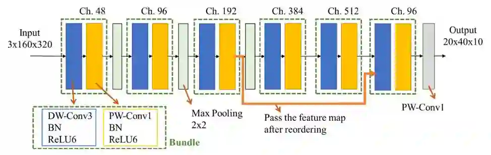 依照自底向上的设计方案,我们设计出 SkyNet 作为参赛模型(图 5)。在设计过程中,被选中的 Bundle 包含了 DW-CONV3x3,CONV1x1,BN 和 ReLU6 这 4 个主要元素。在网络搜索算法堆叠 Bundle 并生成初始 DNN 后,我们对初始网络作了细微的修改,增加了一条用于传送特征图的旁路(bypass,图 5 的橙色连线)。设置旁路的原因在于,我们发现数据集里有 91% 的被测物与输入图片大小之比少于 9%,有 31% 的被测物与输入图片大小之比少于 1%(如图 7 例子)[2]。也就是说,这项比赛任务属于小物体检测任务。所以,我们添加了用于传送浅层特征图到深层卷积的旁路(把第三个 Bundle 的输出直接输入至最后一个 Bundle),减少小物体特征在经过池化层后丢失的机会。由于旁路跨越了池化层,旁路传输的特征图与原输入特征图尺寸并不相同。我们采用特征图重排列(reordering,图 6)去解决这个问题:重新排列经过旁路的特征图,减少其宽和高的同时增加其通道数,并混合不同通道的特征。对比使用池化层,重排列的优势是能在匹配旁路与原输入特征图尺寸的同时,不丢失特征数据。