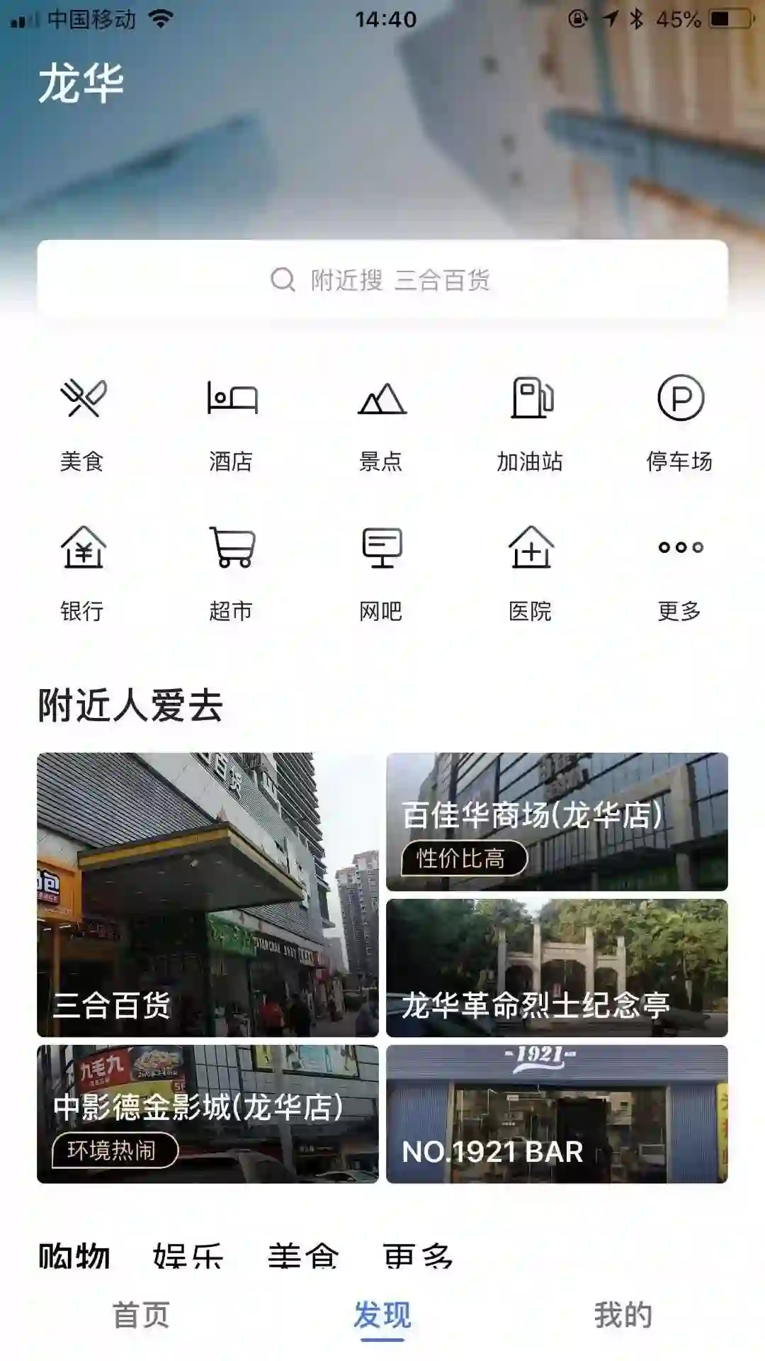 点击“发现周边”后,出现包括美食、景点、酒店、休闲娱乐、车主服务等项目,下方还有超市、洗浴、银行、大学等等,其涵盖的项目包括所有生活服务类需求。