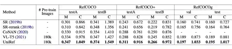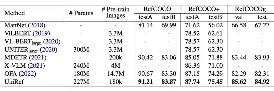 本工作的研究员在三个基准数据集 RefCOCO、RefCOCO+ 和 RefCOCOg 上进行了广泛的实验。实验结果表明,所提出的模型在 REG 和 REC 上都优于以前最先进的方法。