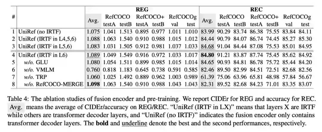消融实验结果如上表所示,可以发现,ITRF 可以提升 REG 和 REC 的性能;在第 6 层中使用 IRTF 优于其他同行;VMLM 和 TRP 使预训练受益;域内数据的预训练显着提高了 REC 的性能,但略微损害了 REG 的性能。