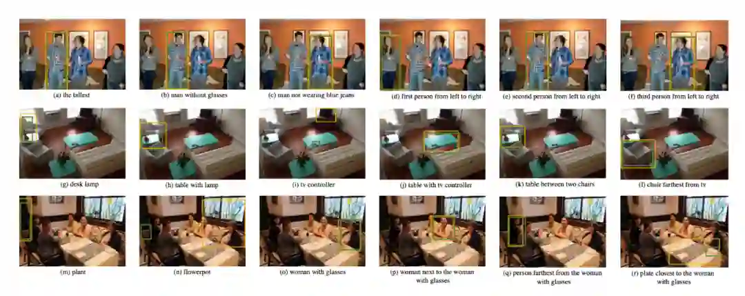 上图可视化了 UniRef 在 REC 中学习的能力,并给出了边界框预测的示例。UniRef 能够处理具有各种属性的描述,例如比较关系(a)、属性识别(b、c)、空间关系(j、k)和计数(d-f)。