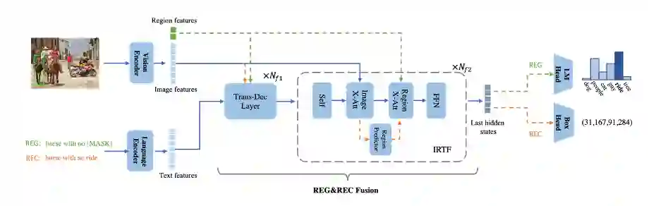 北京邮电大学、字节跳动人工智能实验室以及苏州大学的研究者提出了一个统一的 REG 和 REC 模型(UniRef)。它将这两个任务通过精心设计的图像-区域-文本融合层(Image-Region-Text Fusion layer,IRTF)统一起来,图像-区域-文本融合层通过图像互注意力与区域互注意力来融合图像、区域与文本信息。此外,它可以为 REC 任务生成伪区域输入,以便以统一的方式在 REC 和 REG 之间共享相同的表示空间。