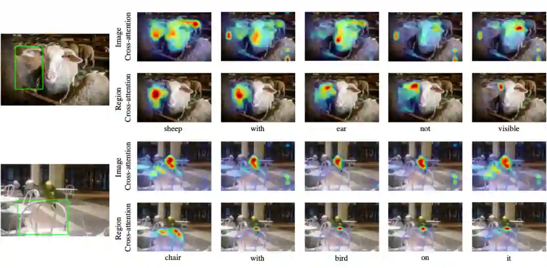上图可视化了 UniRef 如何利用 REG 中的图像和区域信息。在自回归生成过程中对互注意力图进行可视化,包括图像互注意和区域互注意,通过观察案例发现了两个现象: