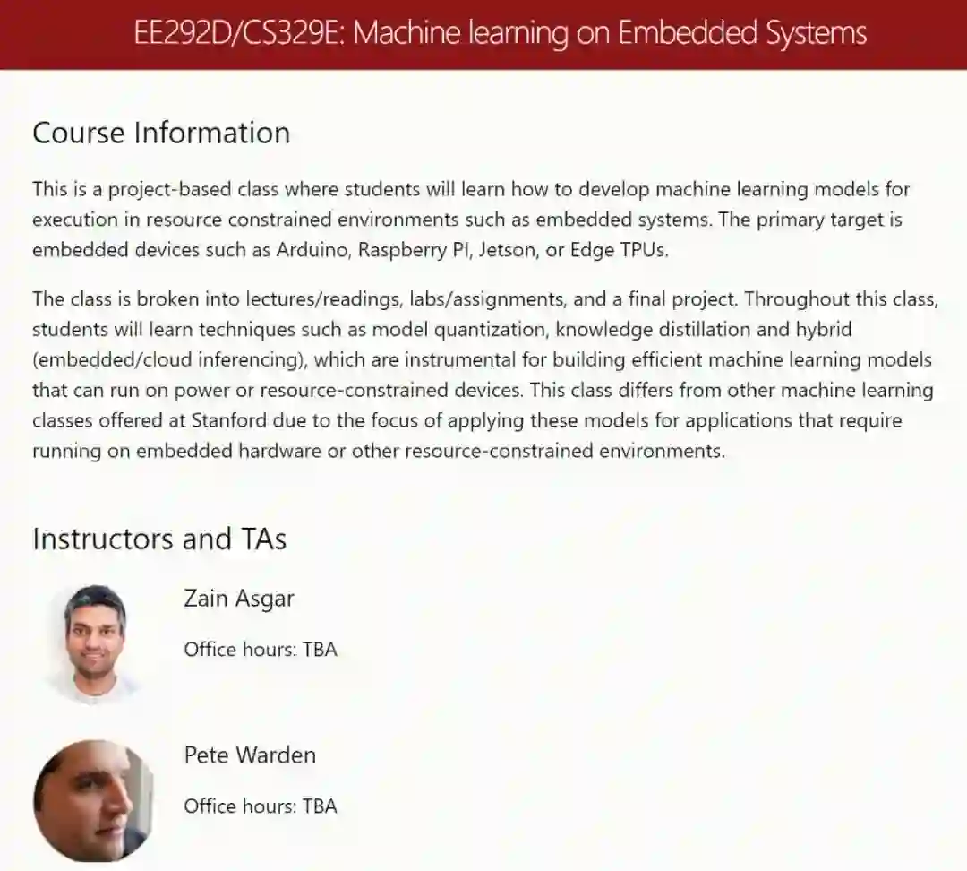 在过去几年里,Warden 一直是 EE292D/CS329E 课程的讲师,该课程主要介绍嵌入式系统中的机器学习,这是一个基于项目的课程,帮助学生学习如何开发机器学习模型,以便在嵌入式系统等资源受限的环境中执行。在该课程中主要目标是嵌入式设备,例如 Arduino、Raspberry PI、Jetson 或 Edge TPU。