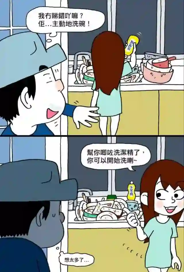 例如最简单的两格漫画,Cuson 路过厨房,发现十指不沾阳春水的 Caca 居然在洗碗池旁边忙碌,惊讶的下巴都要掉下来了。岂料 Caca 回头对他笑说:“我已经帮你挤好洗洁精了,该你来洗碗啦!”