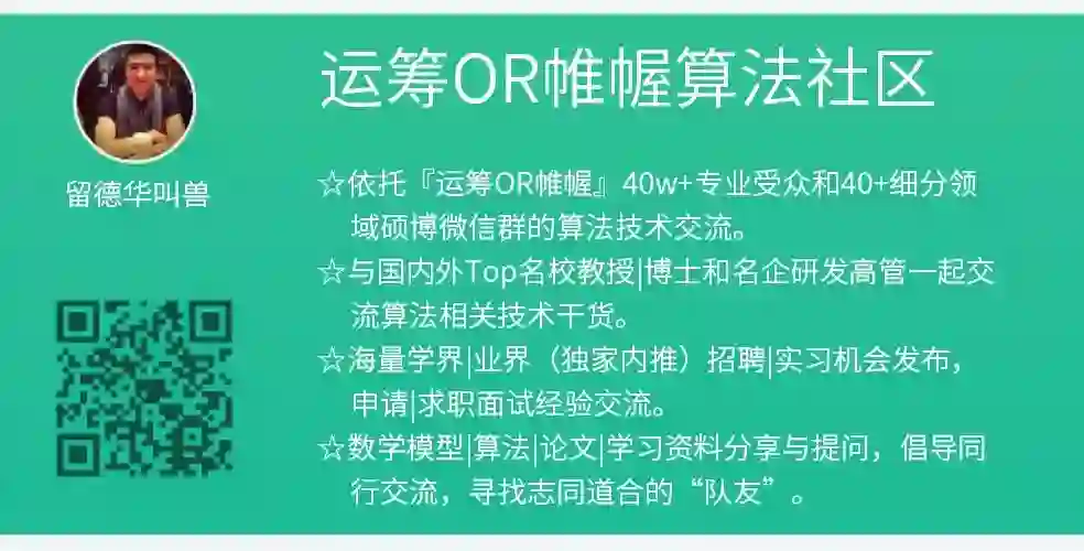 随着算法相关专业热度的提升,考研读博、留学申请、求职的难度也在相应飙升,『运筹OR帷幄』建立了【算法社区】知识星球,涵盖运筹学、数据科学、人工智能、管理科学、工业工程等相关专业,集结社区40W专业受众的力量,提供给大家一个共同的学习交流平台,结交志同道合的伙伴。